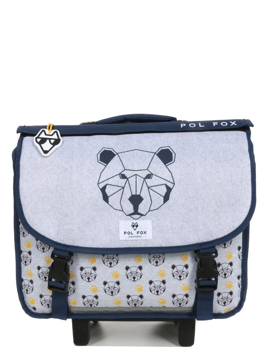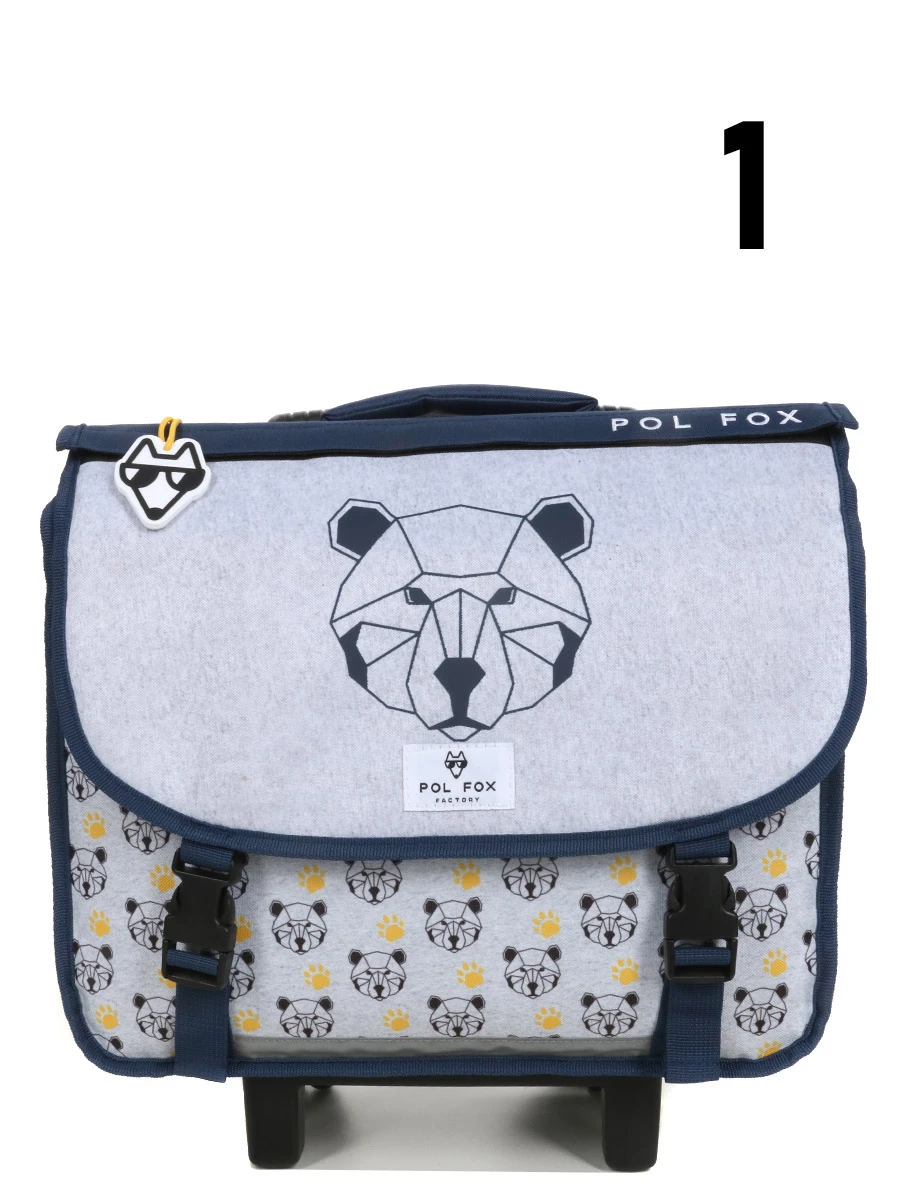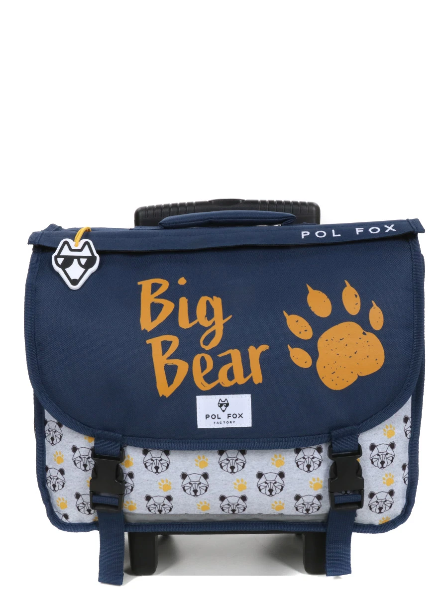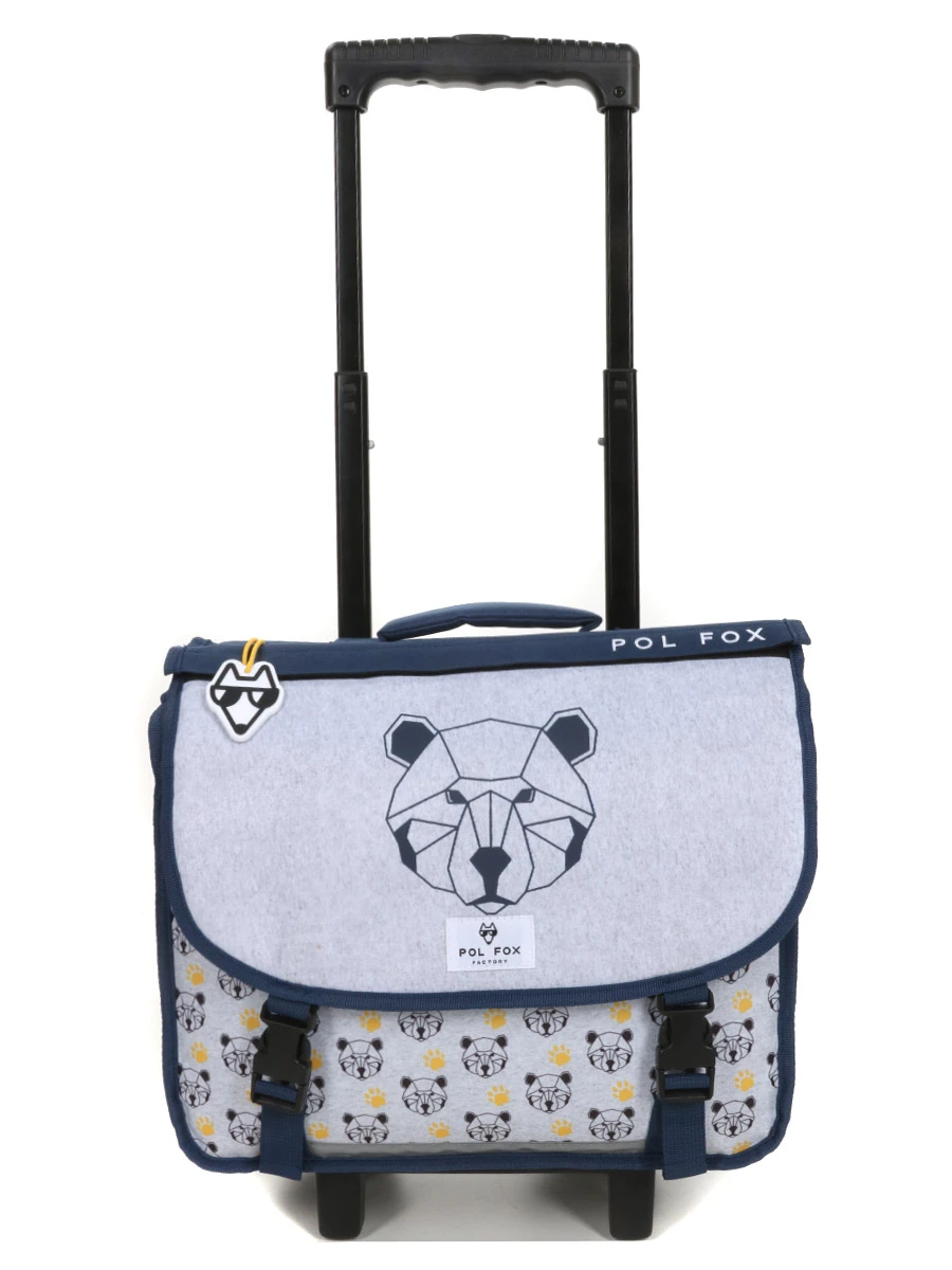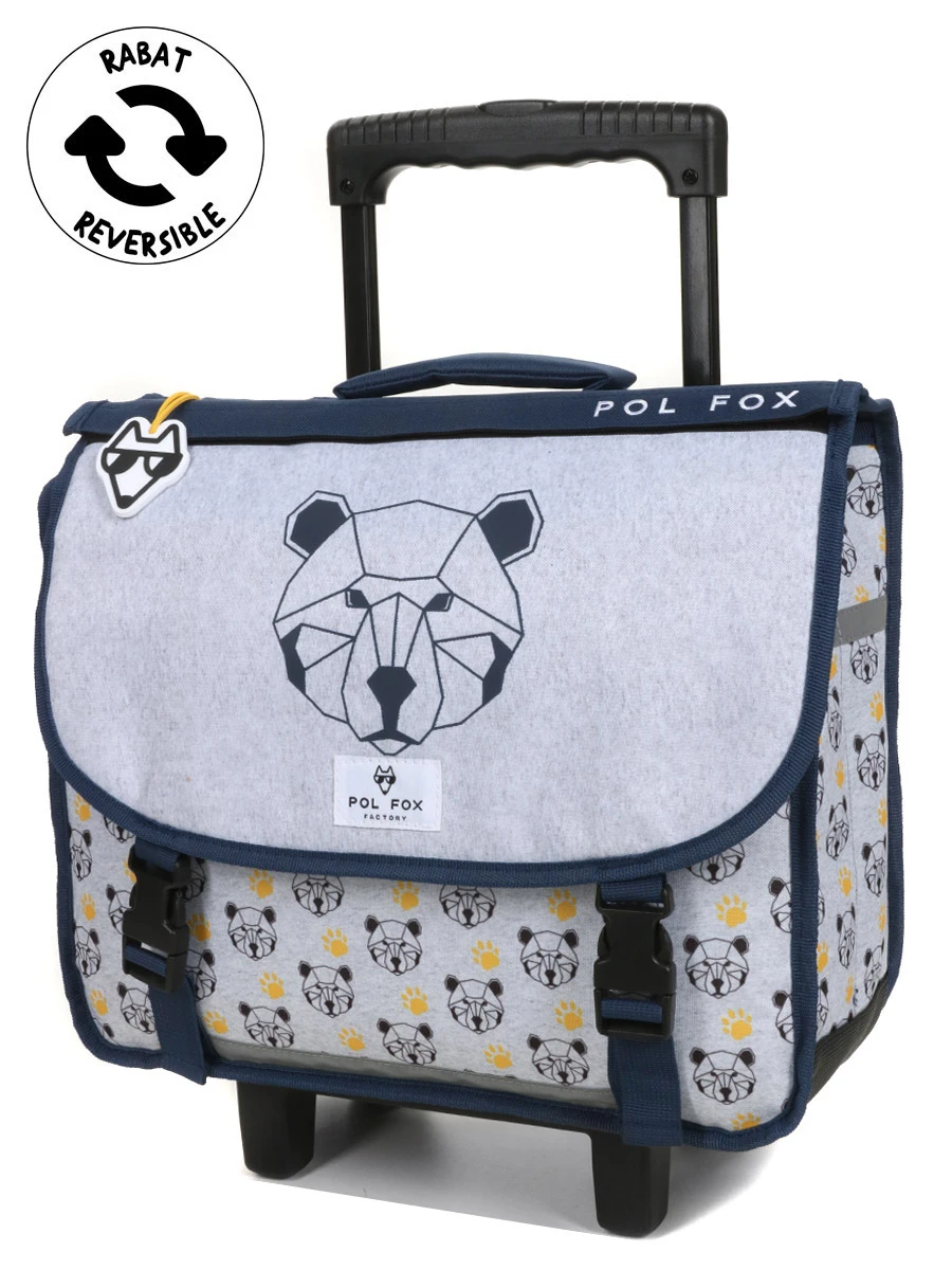 Le cartable à roulettes Réversible Pol Fox Bear 38 cm donne de l’aplomb aux petits garçons pour affronter les journées d’école du CP et CE2. Mi-câlin, mi-sauvage, l’ours qui orne son revêtement est prêt à sortir les griffes pour le défendre. Grâce au rabat bi-face, on choisira selon les jours d’afficher sa grande tête dessinée en polygones ou l’empreinte de sa patte. Pour des trajets à pied sans effort, rien de plus simple que de rouler le cartable à l’aide de son trolley réglable. Les jours pluvieux ne seront pas une menace pour son contenu, grâce à son revêtement en polyester déperlant, sa doublure intérieure et son fond imperméable.