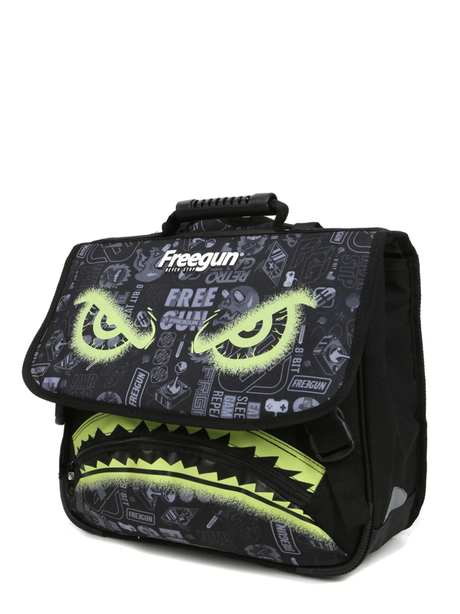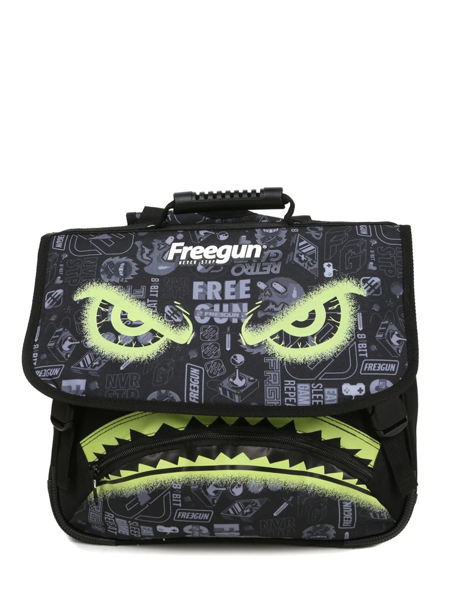 Le cartable Freegun Monster Fluo 38 cm prolonge le plaisir des parties de jeux vidéo jusqu’à la salle de classe avec son imprimé parsemé de dessins rappelant l’univers du gaming : joystick, console, manette et autres personnages pixellisés. L’atout style de ce cartable : le visage de monstre phosphorescent en surimpression sur sa face avant, pour s’imposer même dans le noir. Pour améliorer sa résistance à l’usure, le revêtement en polyester est doté de renforts au niveau du fond et des coins inférieurs. Pratique et confortable, ce cartable est adapté aux élèves de CP, CE1 et CE2.