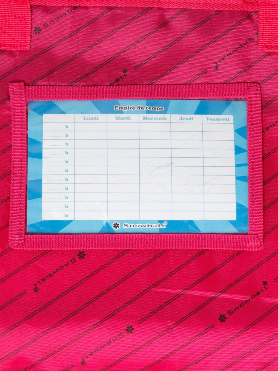 Les 2 compartiments doublés du cartable Snowball Géo Color Girl sont compatibles avec les grands cahiers A4. Les fournitures et les effets personnels peuvent être rangés dans sa poche intérieure zippée ou dans sa poche frontale à fermeture à glissière. On notera également la présence d’un porte planning plastifié et d’une poche pour la règle. Ainsi, toutes les affaires de classe y trouvent ainsi une place appropriée sans difficulté.
