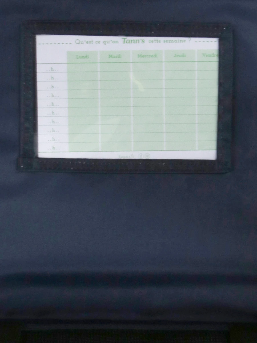 - sa poche transparente pour laisser bien en vue l’emploi du temps de la semaine,