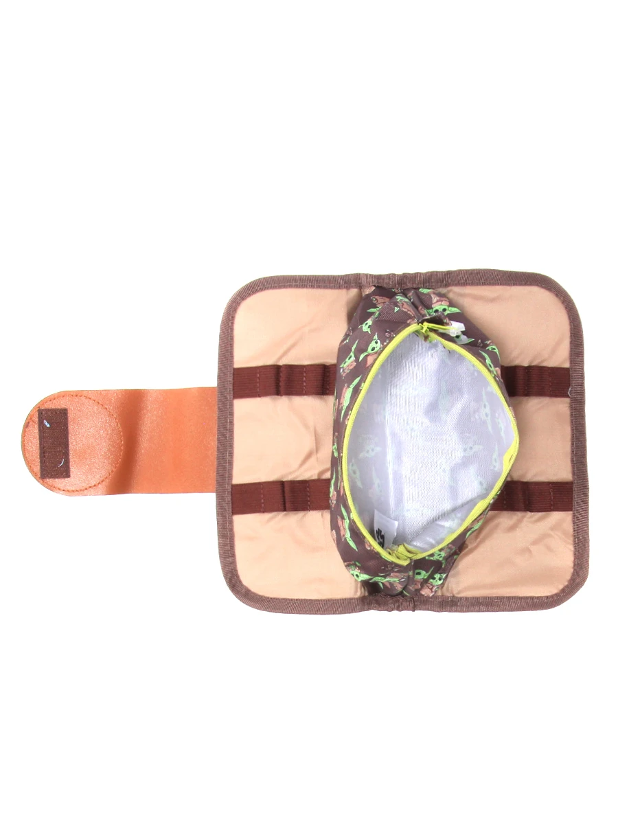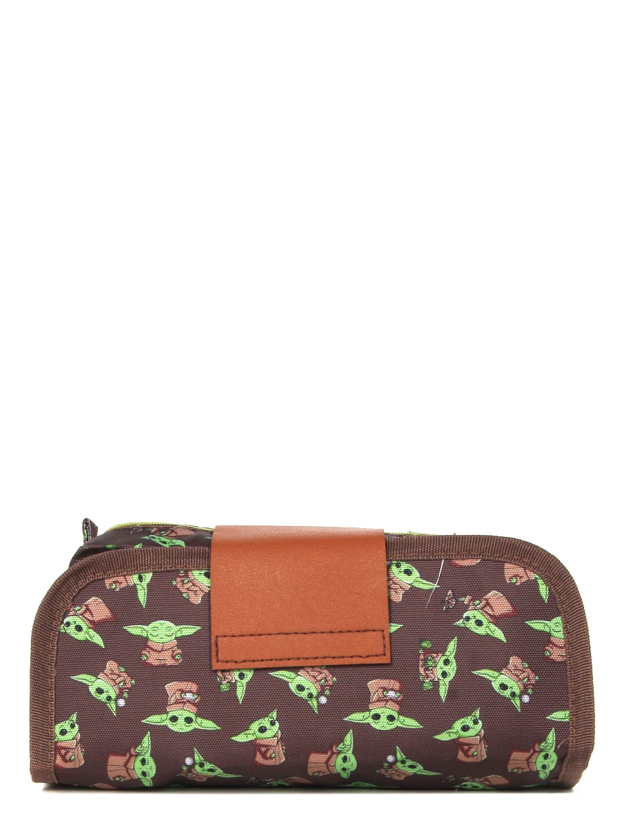 La trousse scolaire Star Wars The Mandalorian Grogu est fermée par une épaisse lanière à scratch en simili cuir. Une fois celle-ci détachée, la trousse se déplie et révèle 5 passants pour stylos sur chaque paroi, et un compartiment zippé au centre. A l’extérieur, une poche zippée permet de séparer des petits accessoires importants du reste du contenu.