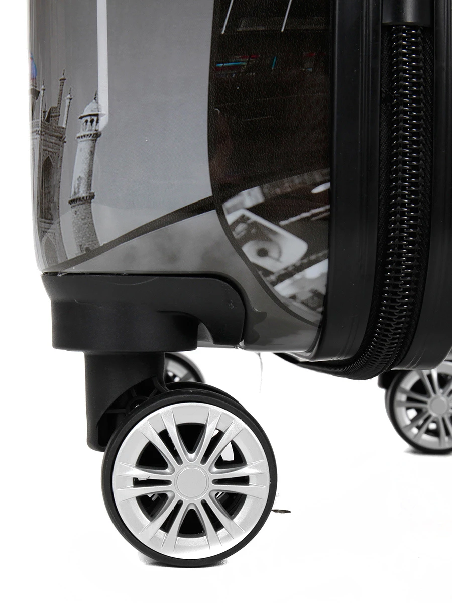 L’ensemble 3 valises Madisson Holiday Memories se compose d’une valise cabine et 2 valises soute extensibles alliant un look tendance et original à un espace de rangement intelligent et un système de roulage confortable. En effet, elles bénéficient d’une fabrication mélangeant ABS et polycarbonate pour une meilleure résistance à l’usure et aux salissures. Sur les 2 plus grandes tailles, des renforts latéraux sont présents pour une protection additionnelle antichocs. Leur coque arbore en sus des imprimés photographiques graphiques mêlant images en couleurs et en noir et blanc pour un style unique. Elles sont parfaites pour les vacances de toute la famille ou pour accompagner les nomades lors d’escapades, de longs séjours… Bon à savoir, la valise cabine est compatible avec les normes EasyJet et Air France.