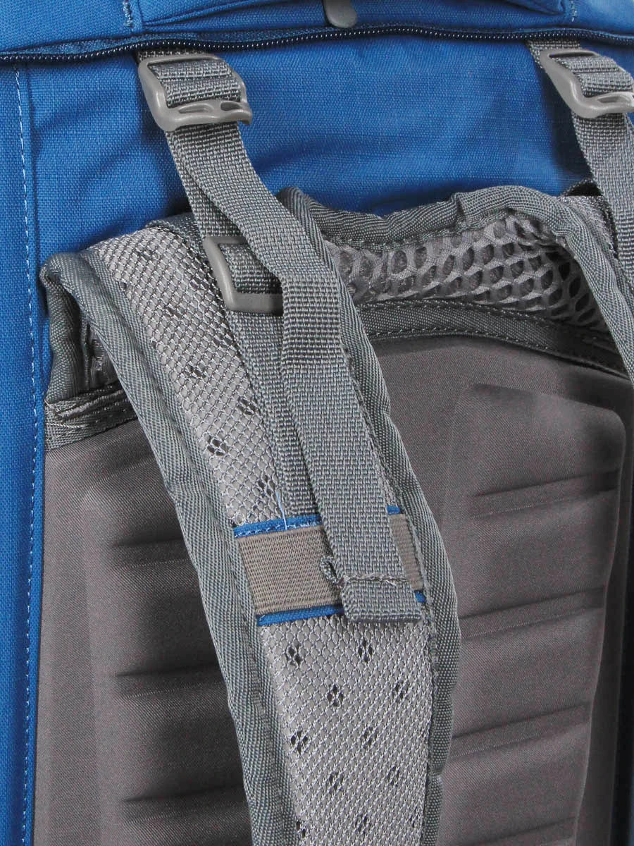 - sur les épaules à l’aide de son dossier rembourré, de ses bretelles moussées, de sa sangle de poitrine, de sa sangle de hanches et des ses sangles de rappel de charge ou
