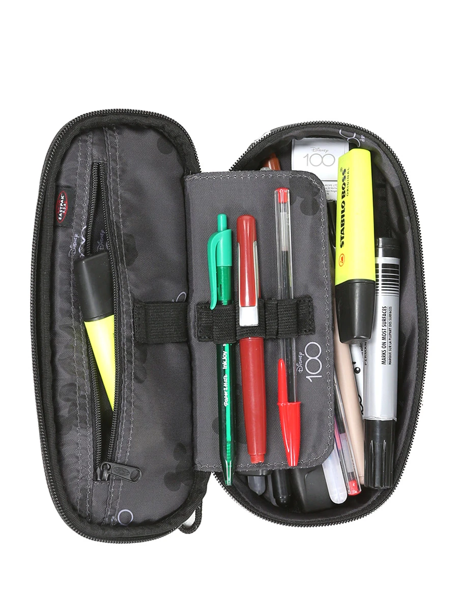 La trousse scolaire Disney 100 x Eastpak Oval dispose d’un compartiment à ouverture zippé renfermant une poche zippée pour les petites fournitures, un passant pour la règle et 4 passants pour stylos pour laisser accessibles les couleurs préférées. Son grand compartiment permet d’emporter nombre de crayons.