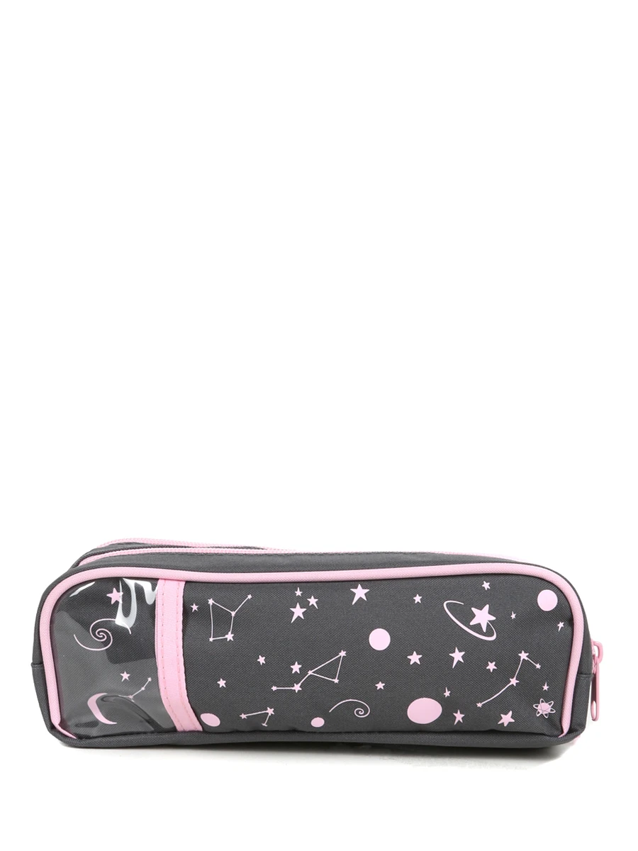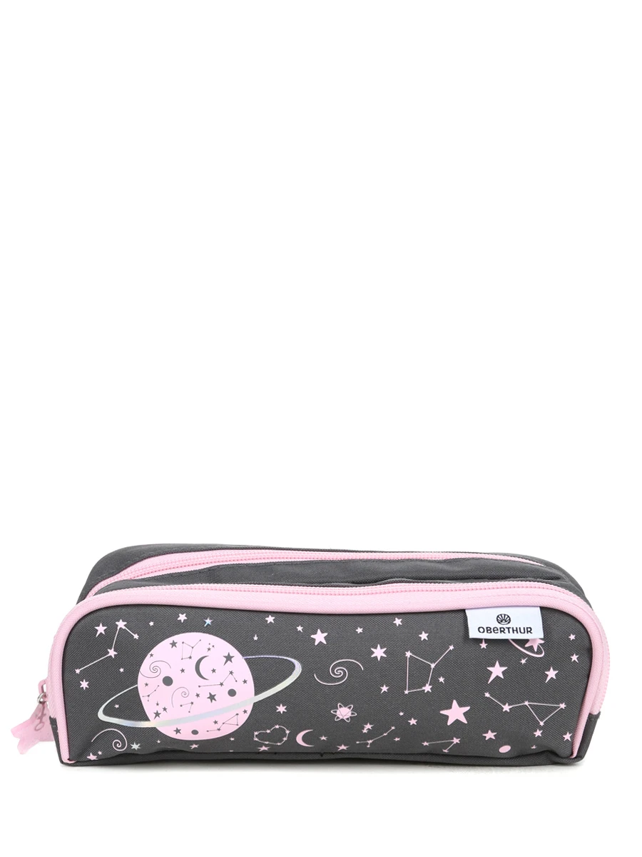 La trousse Oberthur Cosmic Girl offre 2 compartiments se fermant à l’aide d’une fermeture à glissière. Il est ainsi simple et rapide de ranger séparément le matériel d’écriture des affaires de dessin, par exemple. Pour limiter les tracas en cas de fuite d’une cartouche d’encre, son revêtement en polyester possède une finition enduite sur sa face interne. Sur le côté, une poche plate transparente permet de laisser bien en vue le nom de sa jeune propriétaire.