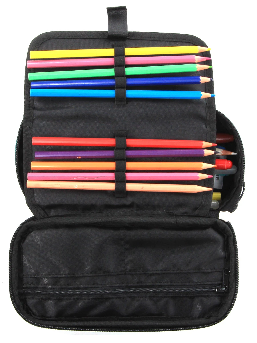 La trousse rectangulaire Walker Pure Eco se présente comme une boîte à crayons et recèle de multiples poches, passants et plateaux pour sérier le matériel de bureau, d’écriture et de dessin. Dans son couvercle fermant par zip sont aménagées deux petites poches plates qui accueillent idéalement des trombones, cartouches d’encre et autre fourniture, ainsi qu’une poche zippée pouvant loger par exemple une paire de ciseau, une petite règle ou les stylos les plus précieux. Un plateau qui se plie et se fixe par deux pattes Velcro est munie de passants dans lesquels se glisse par exemple la collection de crayons de couleur. Le reste du compartiment accueille stylos, crayons à papier, feutre, gomme, etc.