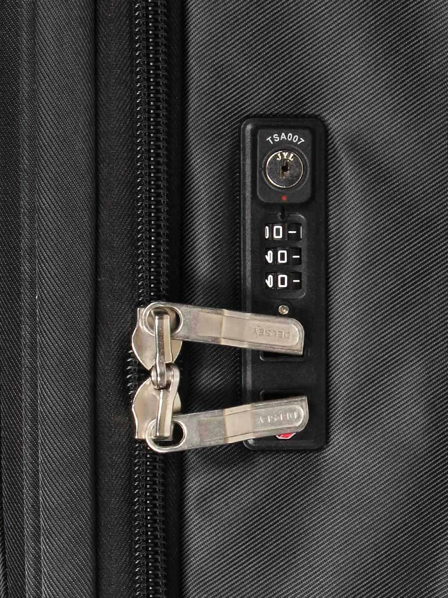 La valise Delsey Sky Max 2.0 glisse silencieusement sur ses 4 doubles roues pivotantes à 360°. Sa poignée télescopique permet de la tracter aussi aisément à côté que derrière soi. Dessus et sur le côté, 2 poignées permettent de la porter à la main si nécessaire. Enfin, pour un verrouillage optimal, il est appréciable de noter la présence d’une fermeture à Zip Securitech très résistante aux intrusions et d’une serrure TSA à code à combinaison chiffrée personnalisable.